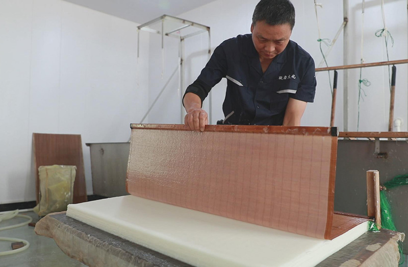 徽州傳統(tǒng)手工楮皮紙,采用傳統(tǒng)手工抄紙工藝,經(jīng)過(guò)27道工序,以手工精細(xì)制作而成,產(chǎn)品主要有楮皮紙、云龍紙、皺紋紙、落水紙、棉紙、版畫(huà)、攝影畫(huà)、手撕畫(huà)專(zhuān)用紙。 生產(chǎn)工序: 浸泡—→腳踏—→清水蒸煮—→切料—→石灰漿浸泡—→蒸煮—→自然漂洗—→腳踏