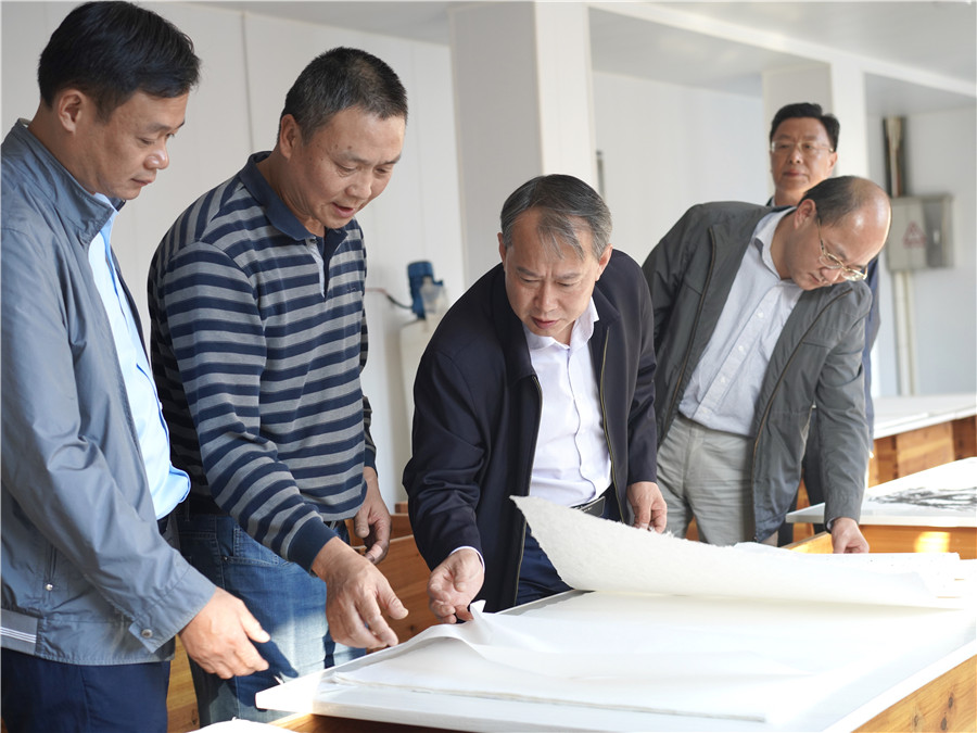10月9日下午,縣長(zhǎng)吳云忠赴海陽(yáng)鎮(zhèn)凝霜文化發(fā)展公司調(diào)研徽州楮皮紙傳承與發(fā)展工作,縣委常委、海陽(yáng)鎮(zhèn)黨委書(shū)記金學(xué)年,縣委常委、縣政府副縣長(zhǎng)程衛(wèi)華參加調(diào)研活動(dòng)。 吳云忠一行實(shí)地察看了徽州楮皮紙生產(chǎn)工藝流程,認(rèn)真聽(tīng)取企業(yè)負(fù)責(zé)人介紹,詳細(xì)詢(xún)問(wèn)徽州楮皮紙制作工藝